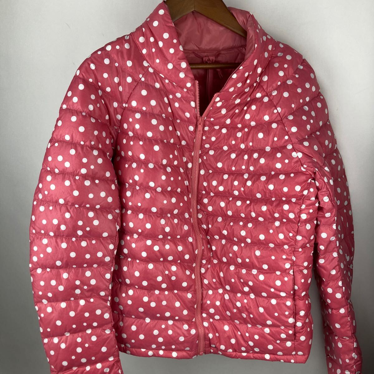 - ダウンジャケット 防風 保温 マウンテンパーカー UNIQLO ユニクロ 子供服 防寒 ピンク 水玉 袋付き ライトダウン M ダウン ジャケット