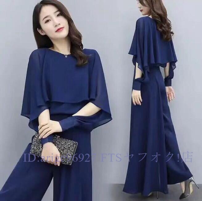 > ★新品Mサイズ レディース上下パンツ スーツ 無地 オシャレ 卒園式 卒業式 入園式 フォーマル シフォン ドレス セットアップ 大人 ブルー