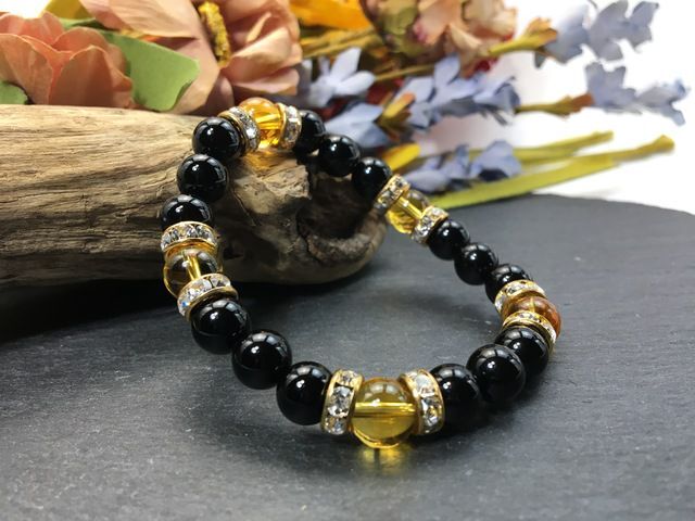 - パワーストーン ブレスレット オニキス&シトリン 天然石ブレス (ゴールド) 8mm 開運 邪気払い 魔除け レディース ブラック 黒