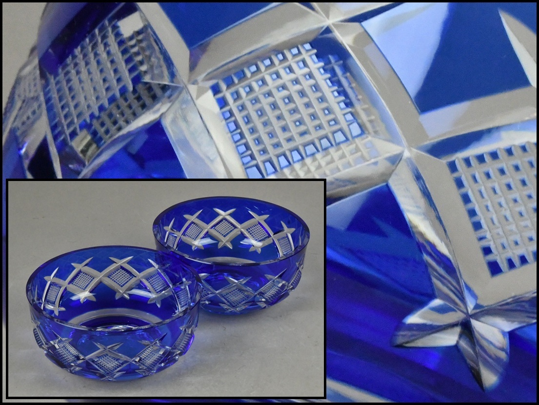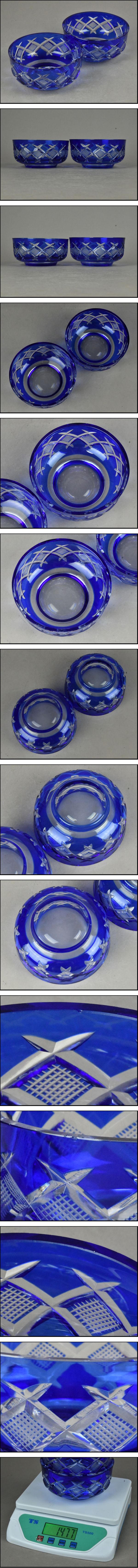 - 【NNK】重厚 江戸切子 クリスタル 青被せ ボウル 鉢 菓子鉢 茶道具 二点 U7-908-11