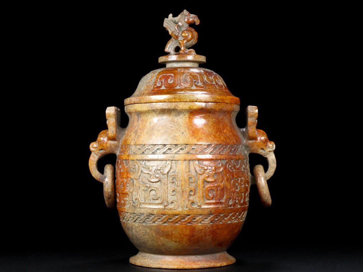 - 「戦漢時期 和田玉 高古玉彫り 獣耳銜環 炉」極細工 賞物 中国古美術 旧蔵出