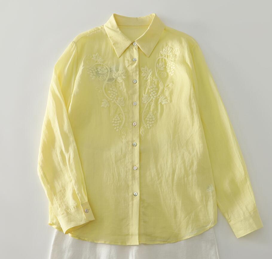 - 秋新品 *シャツ レディース トップス 刺繍 シャツブラウス 開襟 長袖シャツ 大きいサイズ 通勤 通学 薄手 花柄 ブラウス* イェロー
