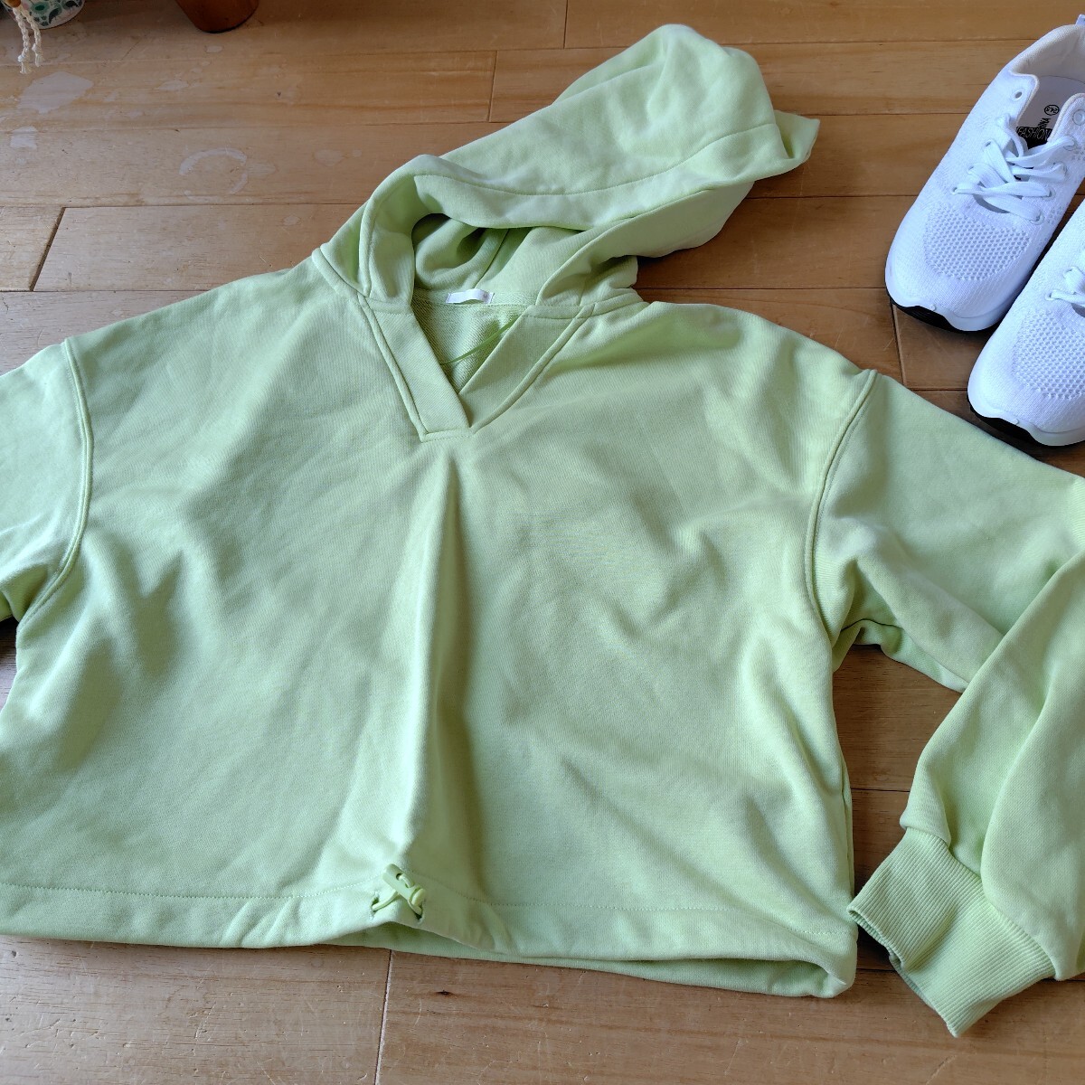 - GU コットン レディース フード付きトレーナー M 若草色 丈感 かわいい 美品☆