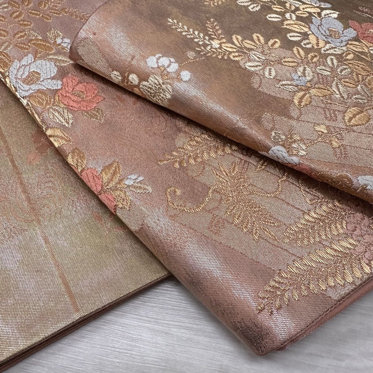 - 袋帯 椿に梅 松藤模様 美しい引き箔 正絹 着W-4489