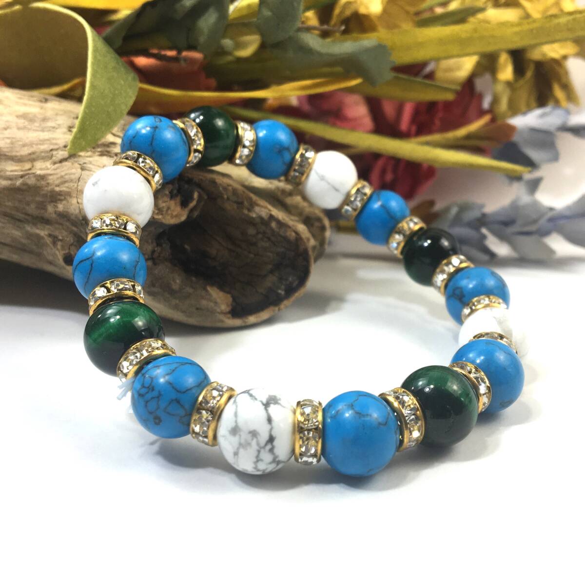 > グリーンタイガーアイ×ハウライト×ターコイズ パワーストーン ブレスレット (ロンデル: ゴールド) 10mm メンズ・レディース