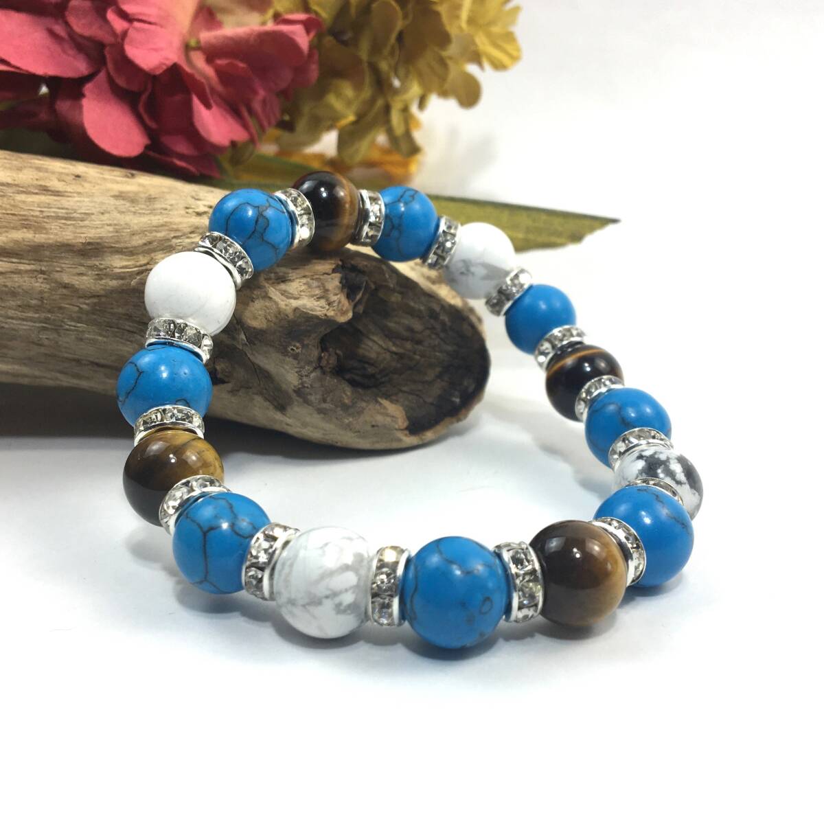 > タイガーアイ×ハウライト×ターコイズ パワーストーン ブレスレット (ロンデル: シルバー) 10mm メンズ・レディース