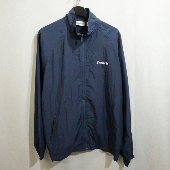 > r415 90sビンテージ Reebok リーボック ナイロンジャケット■1990年代製 表記Lサイズ ネイビー 紺 フルジップ 刺繍 アメカジ 古着 古着卸