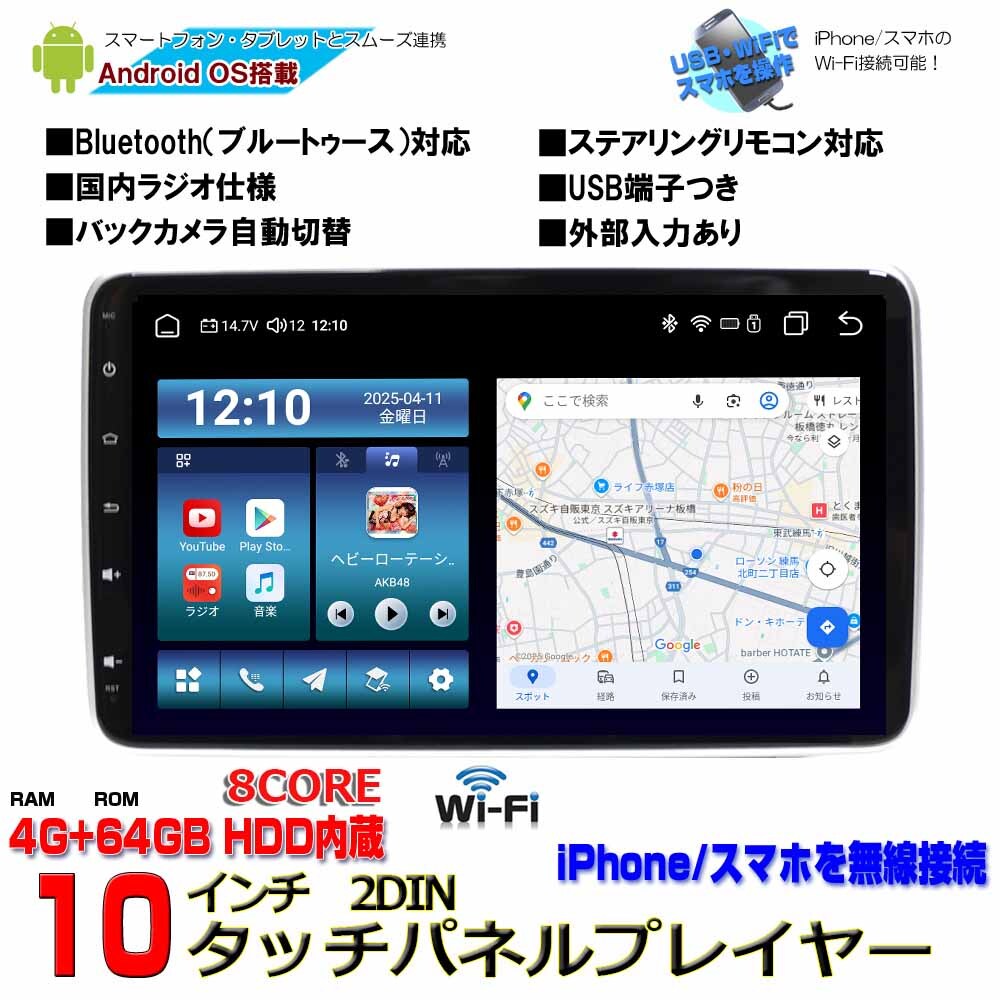 - RAM4G ROM64G 8コア アンドロイドカーナビ2DIN10.1インチタッチパネル iPhone Androidミラーリンク対応 WiFi ラジオ Bluetooth