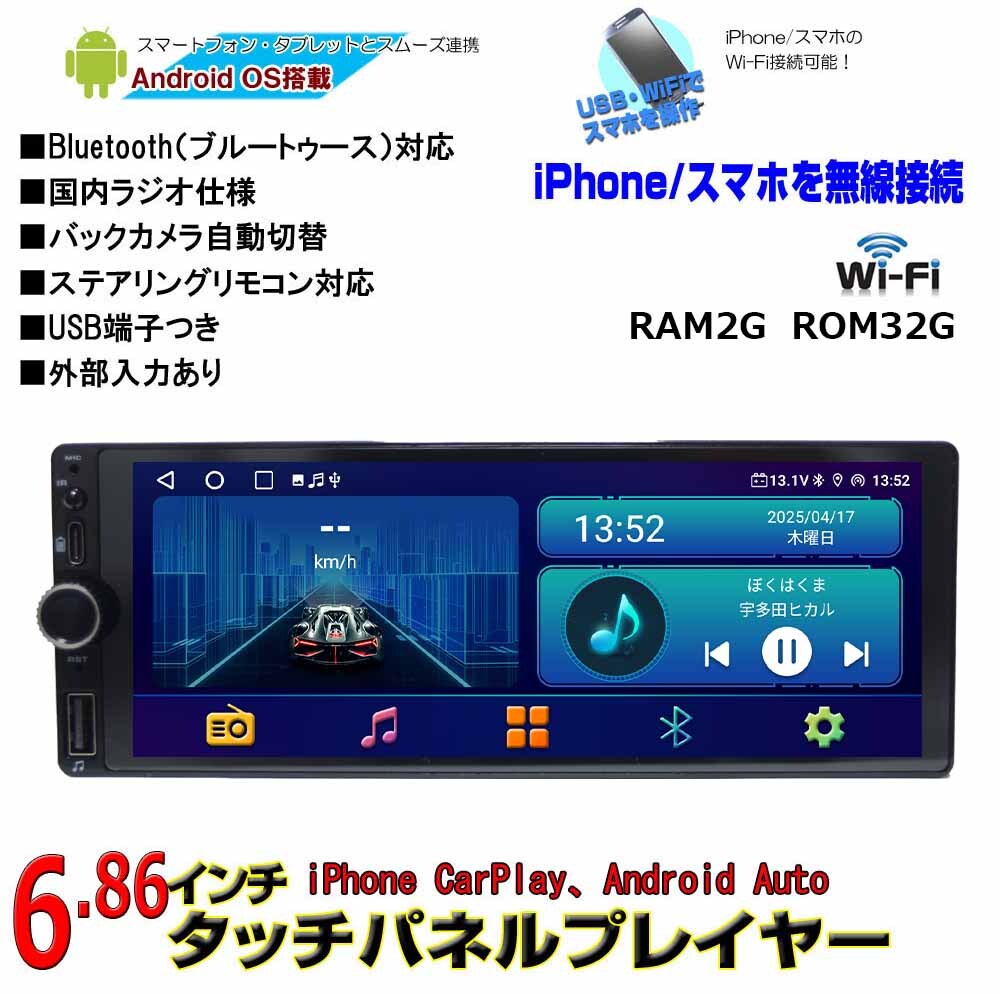 > 1DIN6.86インチタッチパネルプレイヤー+170度バックカメラカーナビAndroid搭載CarPlayAndroidautoラジオUSBBluetoothRAM2GB+ROM32GB