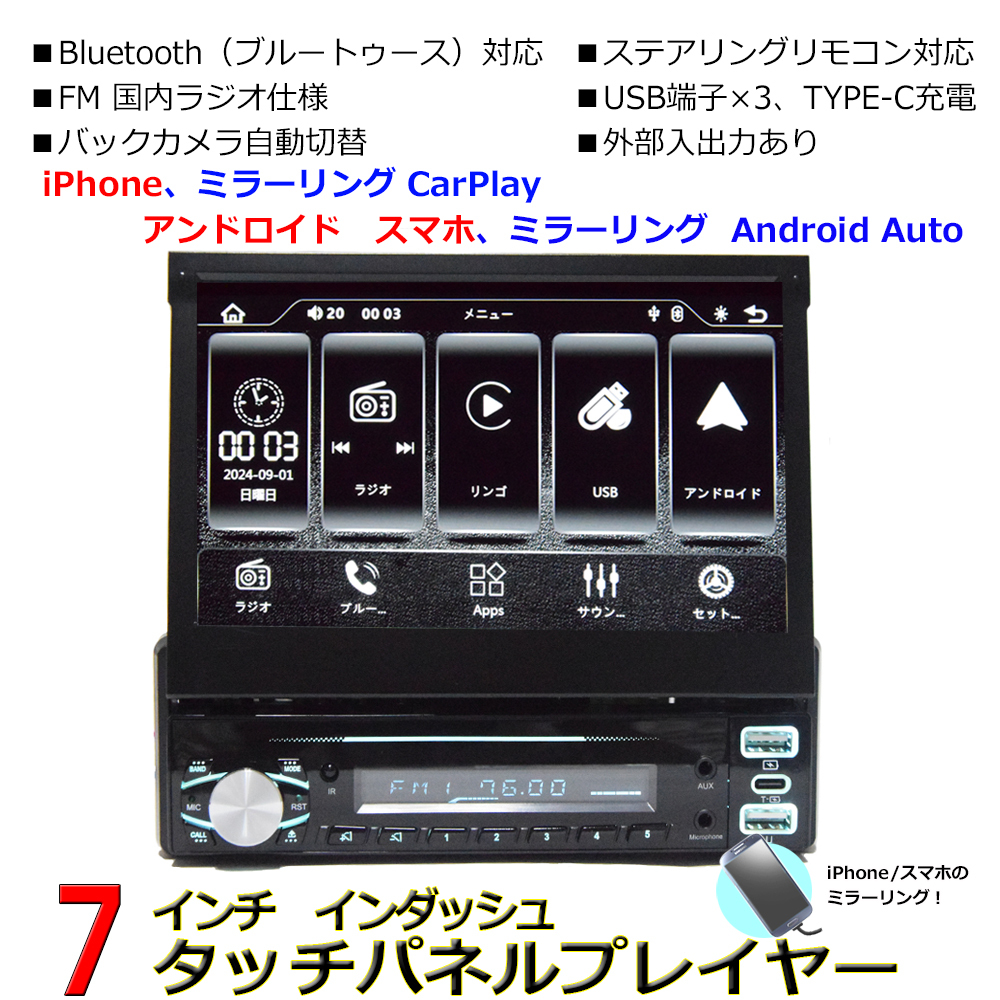 > 車載 1DIN 7インチインダッシュプレーヤー ラジオ USB Bluetooth内蔵 CarPlay ミラリング Android Auto iPhone 無線接続【一年保証】
