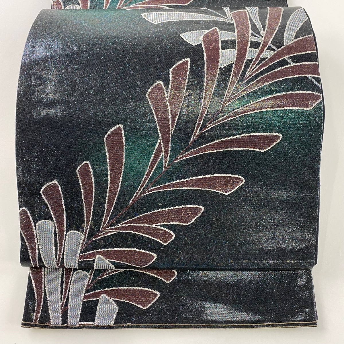 - 袋帯 秀品 葉柄 幾何学 箔 ぼかし 深緑 六通 正絹 【中古】