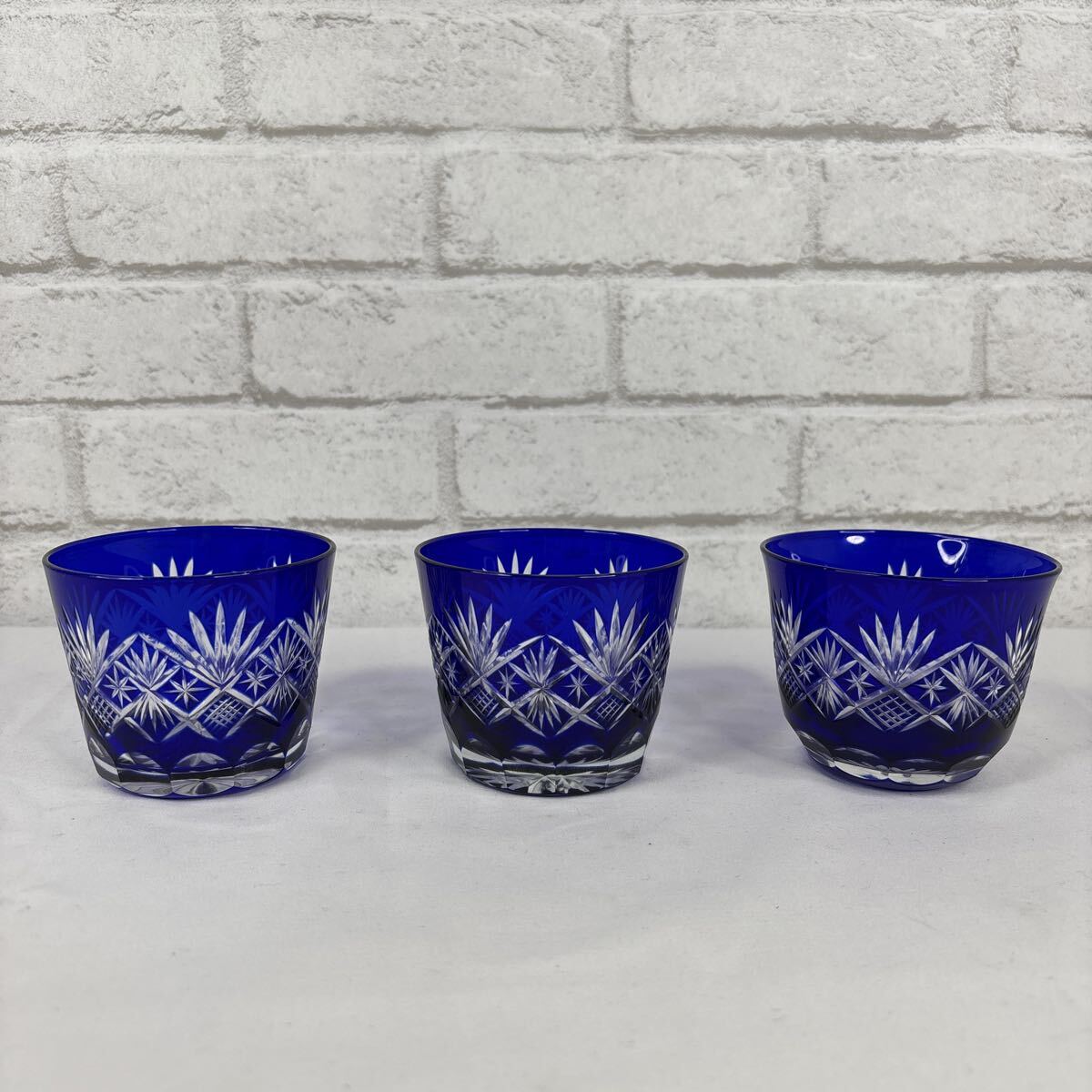 - 瑠璃色 カットグラス 切子風 グラス 3客セット 気泡あり 欠けあり 江戸切子 切子グラス 青 ロックグラス
