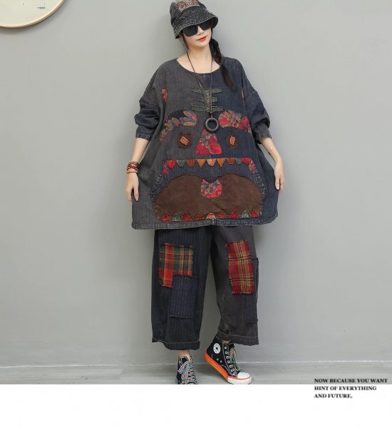 > gl チュニック&ズボン2点セット 刺し子 綿&麻 洋服ミックス アンティーク風 ロマンファッション バッチ 古い布