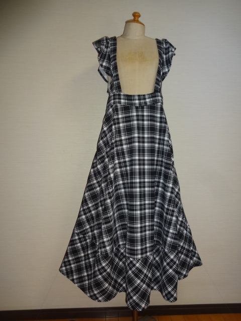 - モノトーンチェック柄肩フレアーフリル後ボタン開き裾切替ジャンスカOp