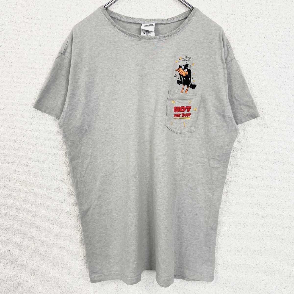 > 古着 used Warner Bros ワーナーブラザーズ 半袖刺繍ポケットTシャツ LOONEY TUNES グレー Mサイズ