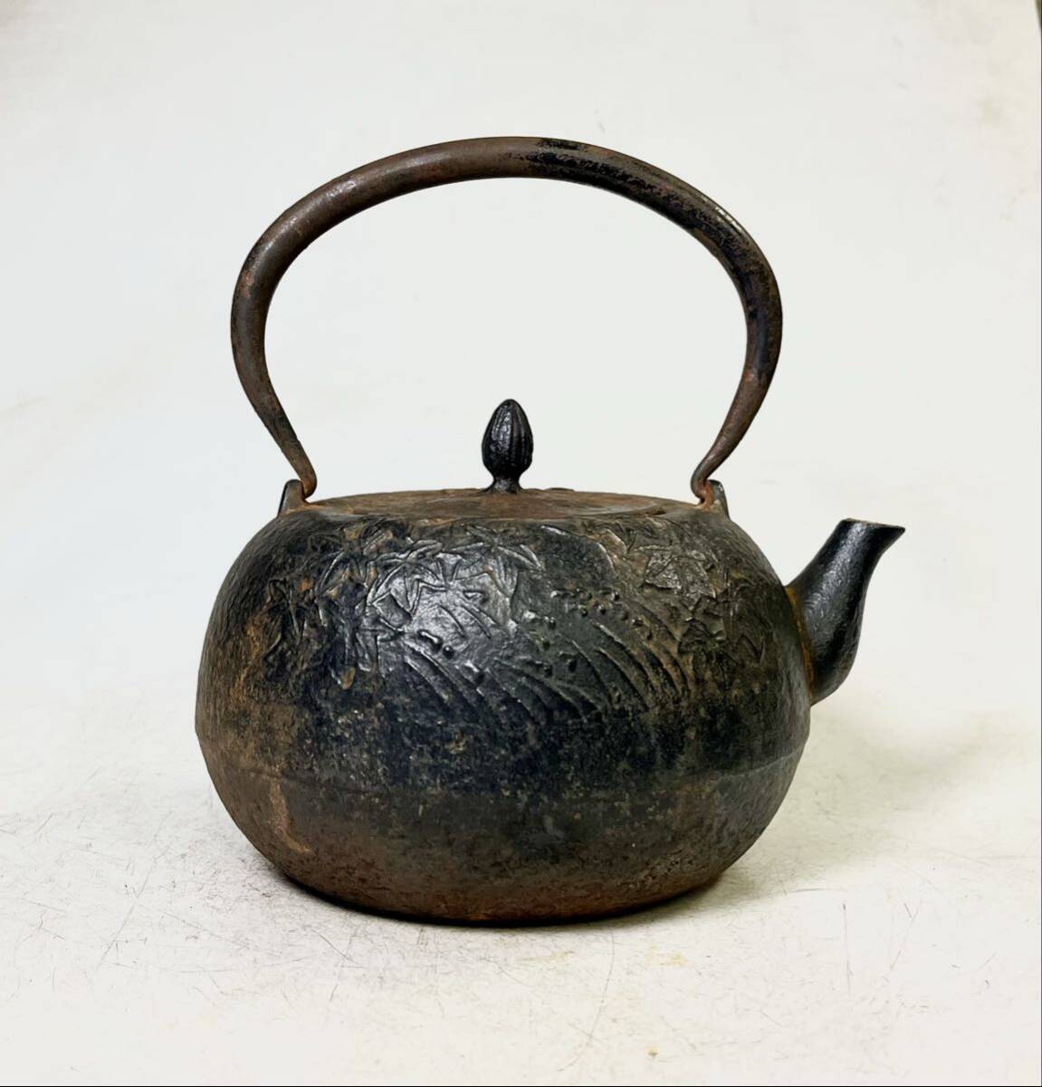 - 古作 南部鉄瓶 紅葉地紋 鉄蓋 煎茶道具