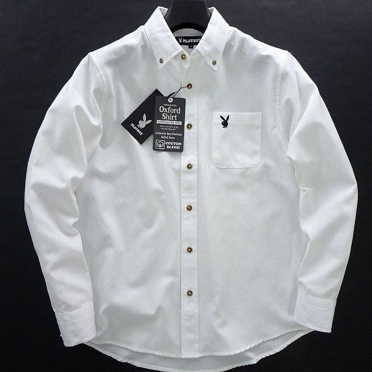 - 新品 プレイボーイ 25年春夏 オックスフォード シャツ L 白 【PB251026_7_L】 PLAYBOY 長袖 ロゴ 刺繍 ボタンダウン オックス コットン