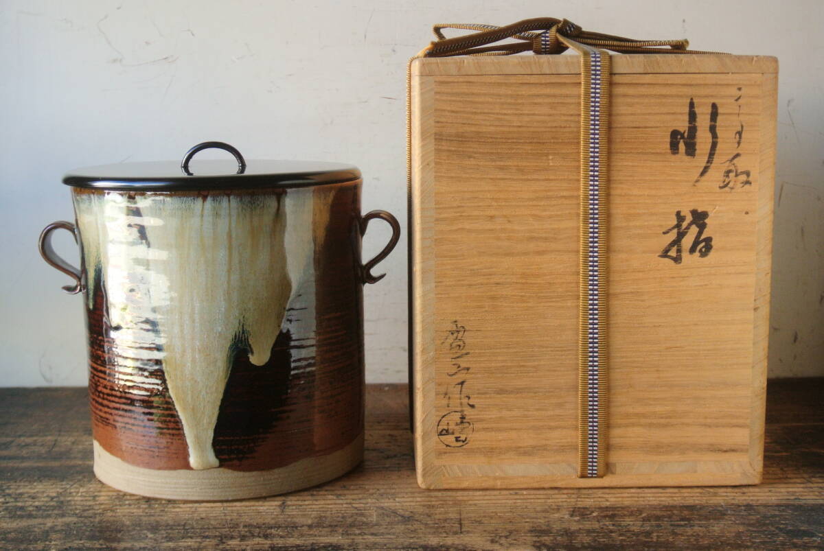 鬼丸雪山 高取耳付水指 塗蓋 共箱 本物保証