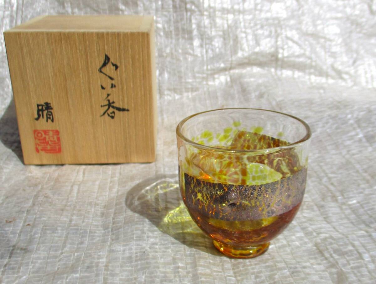 - 状態良好・新倉晴比古 ガラス製 ぐい呑 プラチナ箔? 在銘 共箱・売切