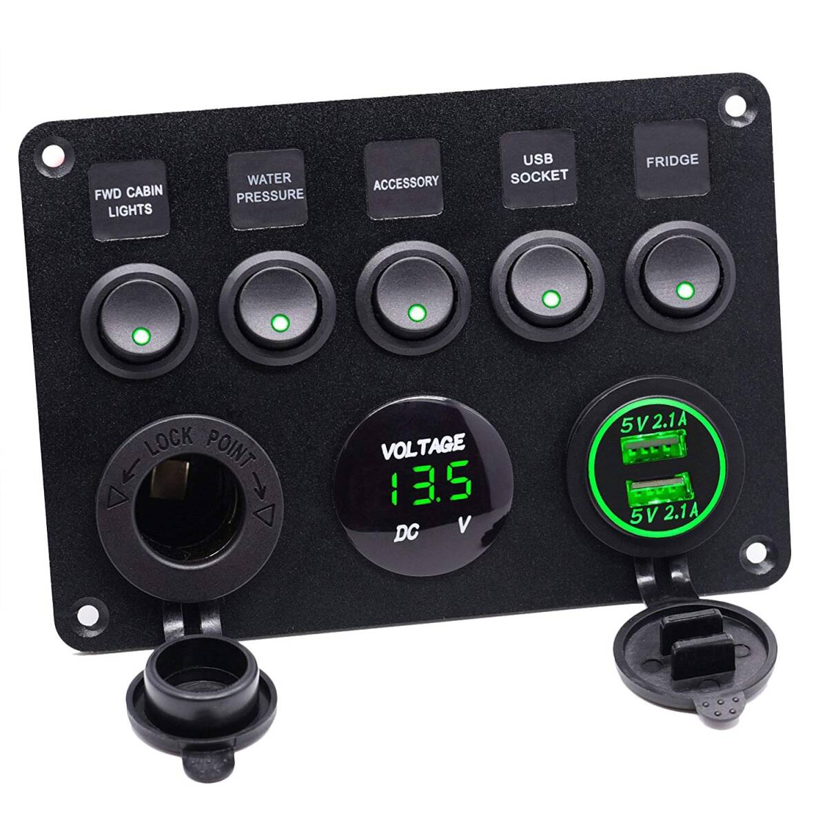 - マリンスイッチパネル 防水+シガーライターソケット+デュアルUSB電源+ 2ポートLED電圧計 5オン/オフスイッチDC 12V
