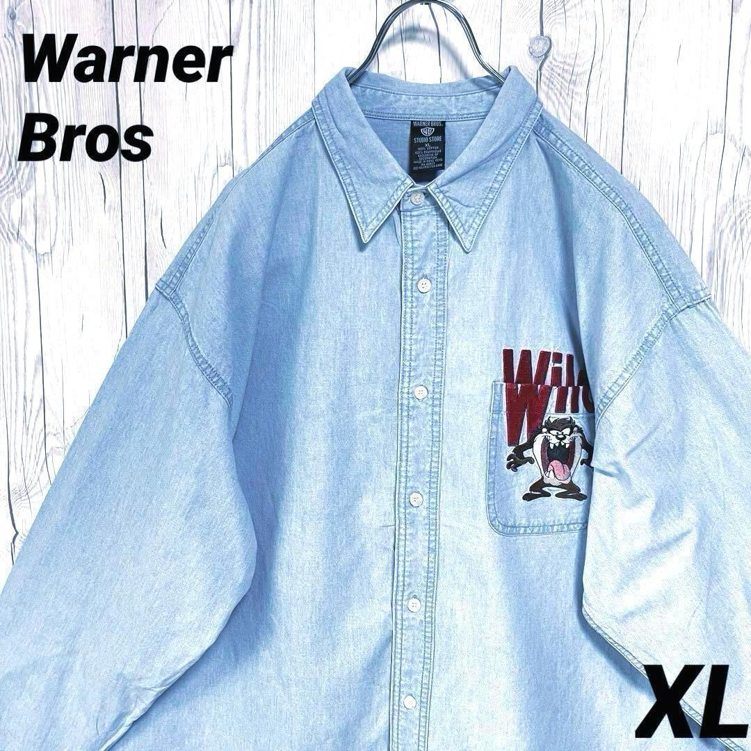 > Warner Bros ワーナー ルーニー・テューンズ デニム長袖ボタンシャツ メンズXLサイズ タズマニアン・デビル刺 アメキャラ 青