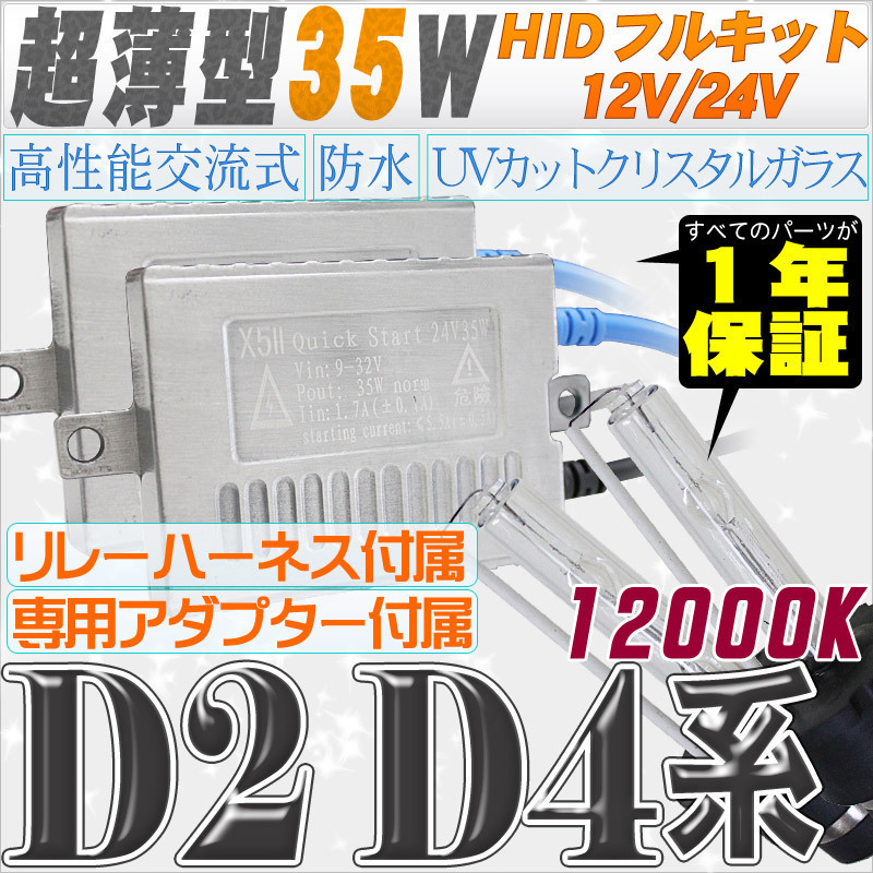 - 高性能 薄型HIDキット 35W【D2C/R/S】【D4C/R/S】 リレー付 12000K 12V/24V 【交流式バラスト&クリスタルガラスバーナー】