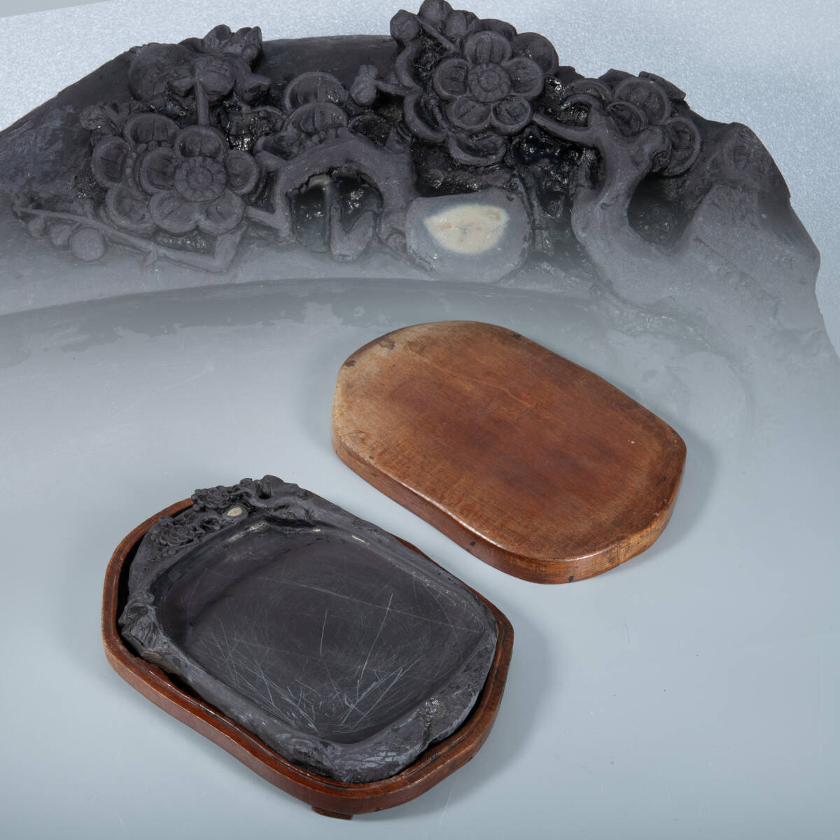 - 中国硯 端渓硯 老坑 氷裂 石眼 彫花鳥文硯 唐木箱 唐物 書道具 硯本体 20x13.5cm 厚み2cm