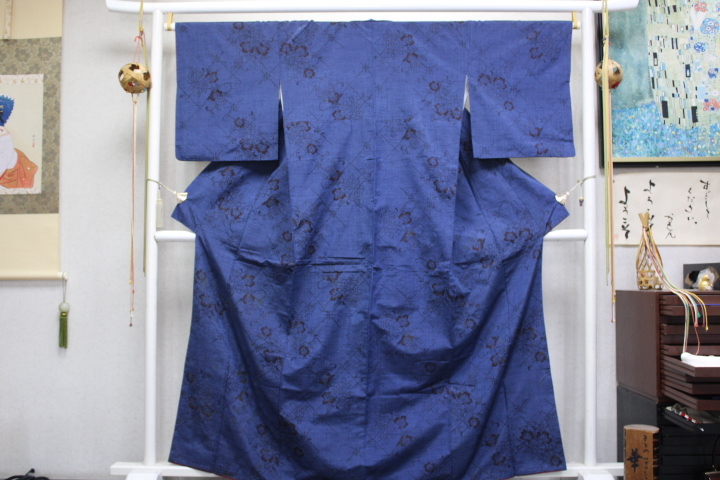 > きもの今昔9026 紬のきもの 広衿袷手縫い仕立 新潟十日町方面紬 紺色地テッセン風の柄 身丈162cm