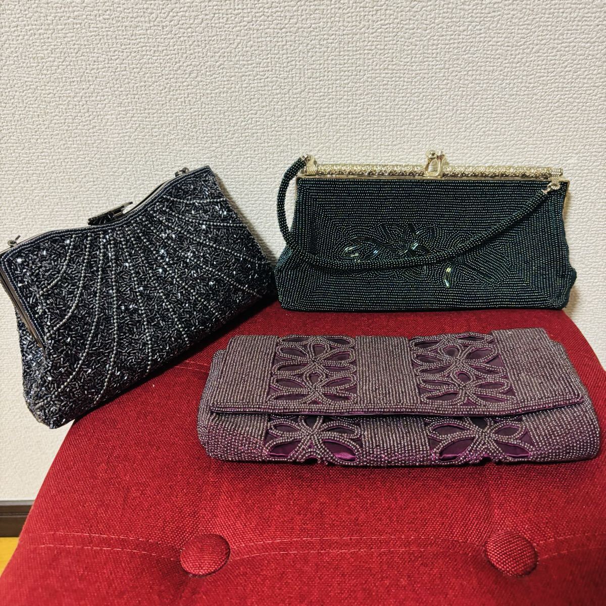 - 和装小物 和装バッグ ビーズバッグ まとめて3点 ハンドバッグ 総ビーズ 花 流 グリーン パープル ヴィンテージ がま口 昭和レトロ