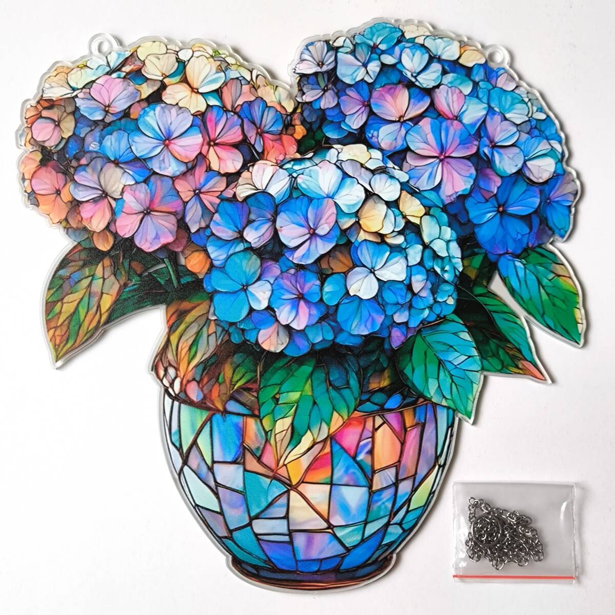 - 【紫陽花と花瓶・アジサイ】アクリルプレート 飾り サンキャッチャー チェーン付き オブジェ お洒落 壁や窓辺の飾りに◎