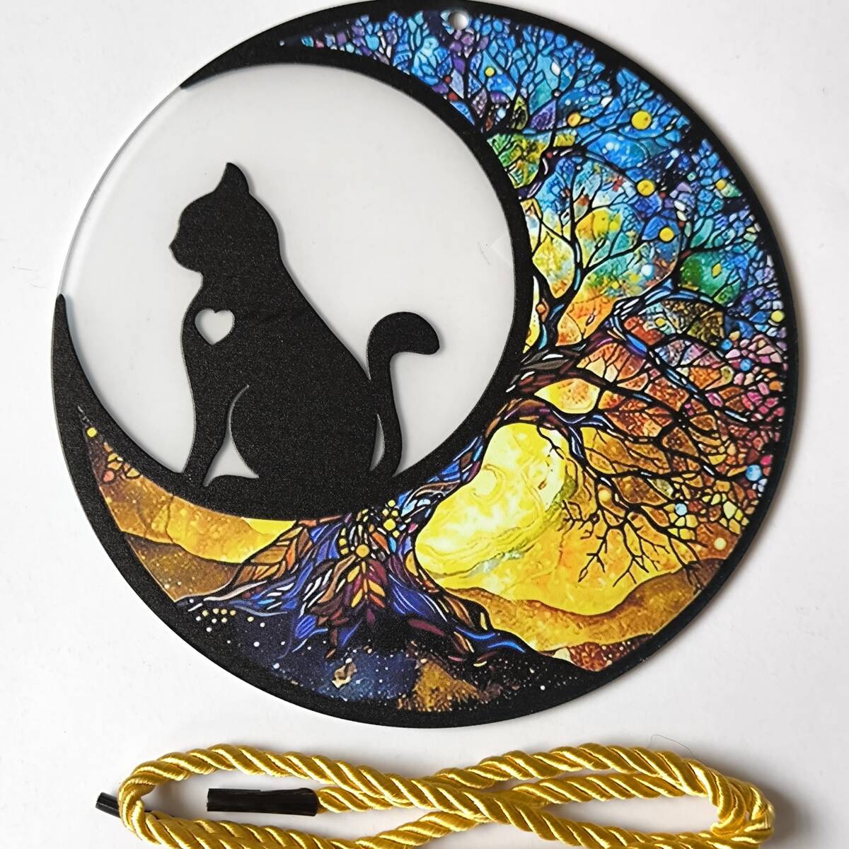 - 【三日月と黒猫・生命の樹】アクリルプレート 飾り サンキャッチャー 紐付き オブジェ お洒落 壁や窓辺の飾りに◎◎