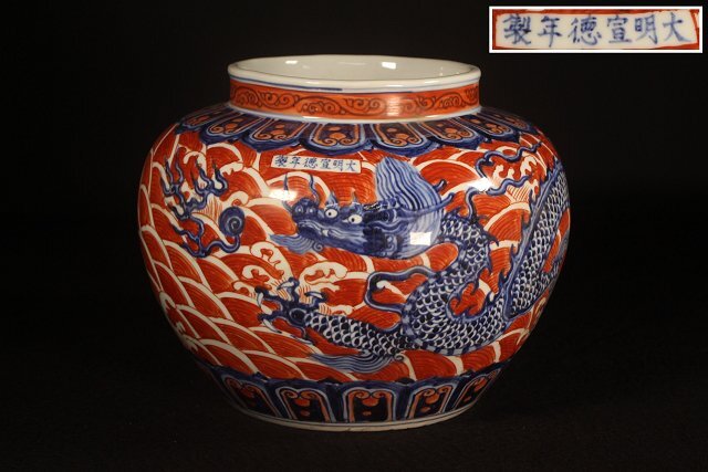 - 特別依頼出品 三井家由来某寺院所蔵 大明宣徳年製 釉裏紅染付大壺 龍紋 高さ約27.5cm (検)青花 赤釉 唐物