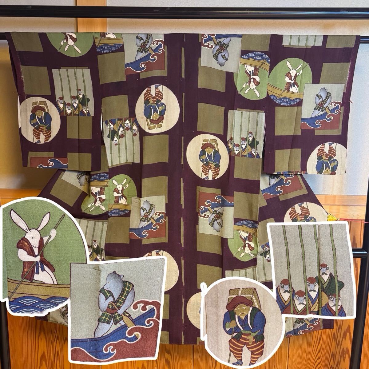 - うさぎ クマ 雀 昔話 動物 襦袢 縮緬 着物 花柄 アンティーク着物帯 絹 正絹 アンティーク レア リメイク 帯 レトロ 大正ロマン レトロ
