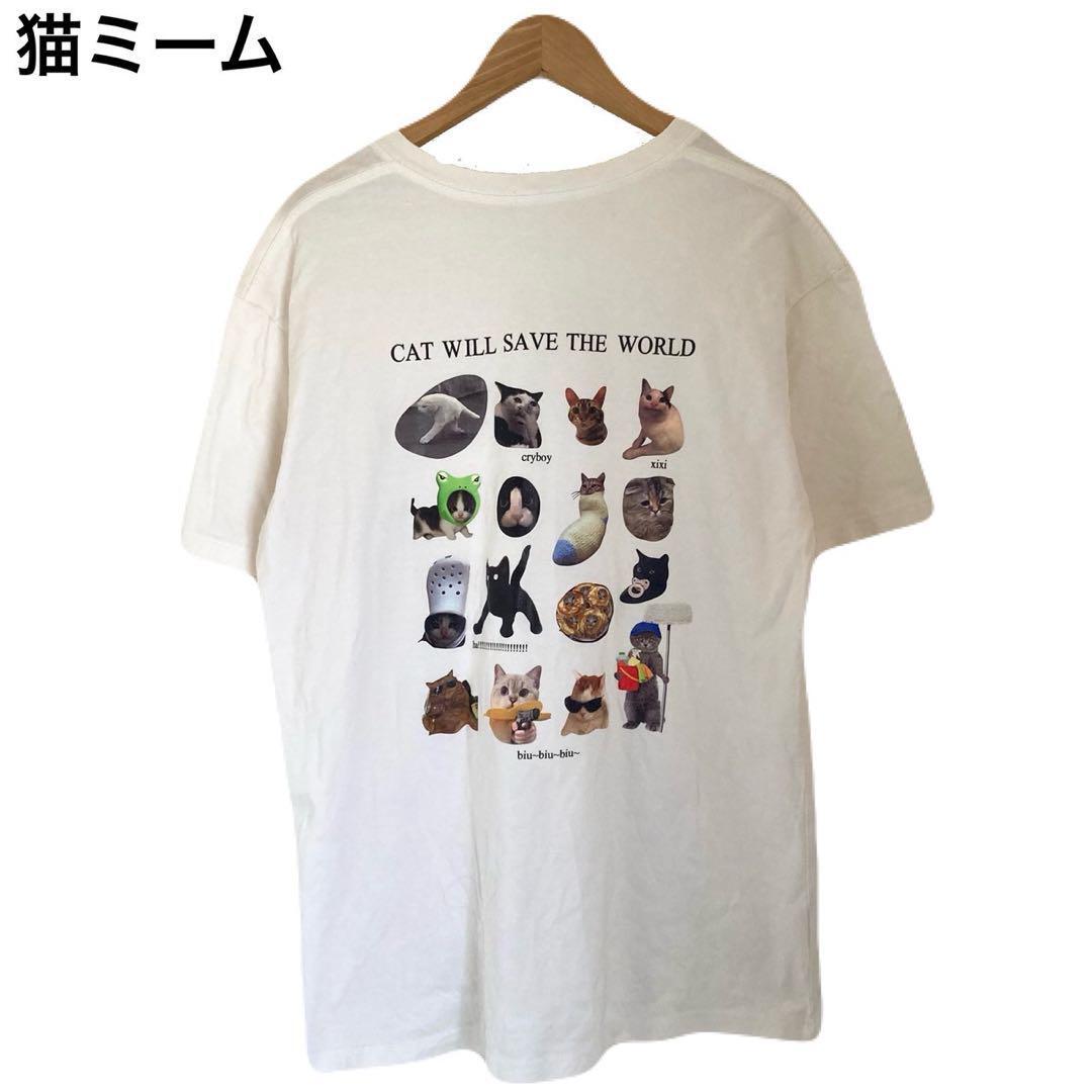 - 猫ミーム プリント アニマルTシャツ 半袖 レディース 動物 ホワイト 丸首