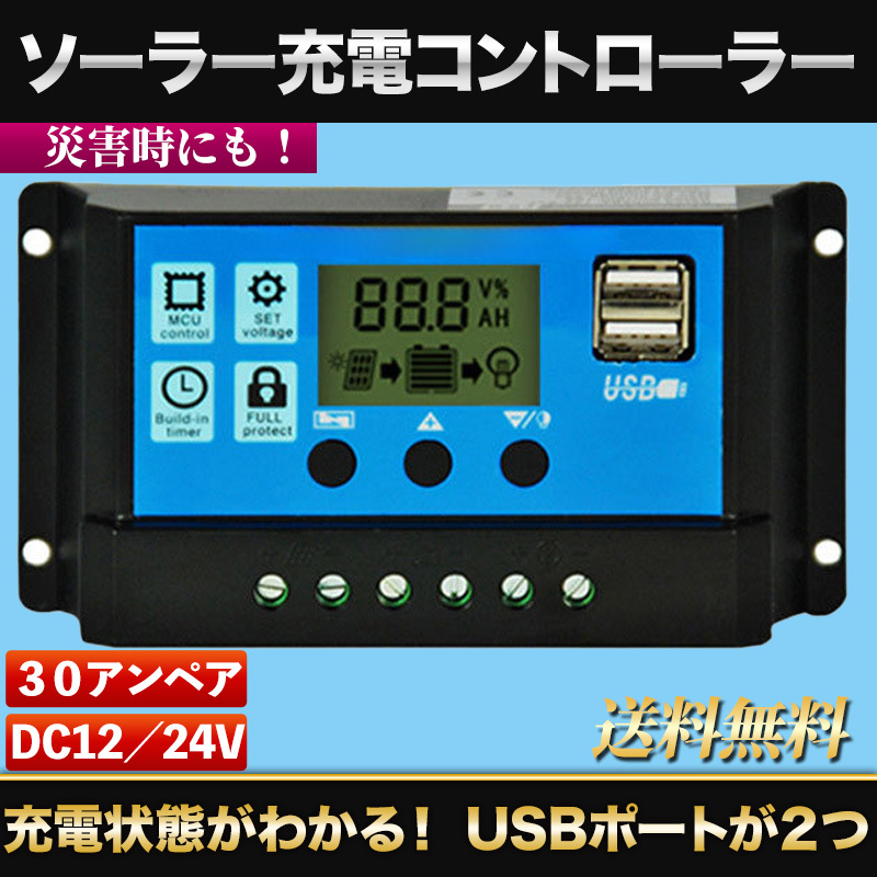 - ソーラー充電コントローラー 30A 12V 24V ソーラーチャージコントローラー USB2ポート付き LCD 液晶 自動調整機能 太陽光パネル 災害時にも