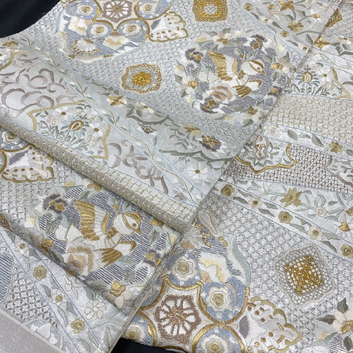 - 着物月花 三大総刺繍 仙頭刺繍 相良刺繍 蘇州刺繍 引箔 華文様 花鳥文様 袋帯 未仕立て品 六通柄 正絹 金銀糸 ob7168