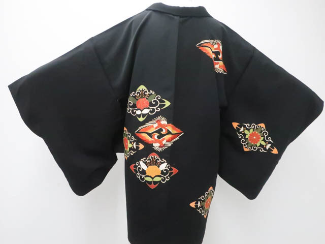 - 《古美術京松》リサイクル着物 羽織 黒羽織 菱 向かい鳥文 金糸 羽織紐別売り 正絹 身丈約82cm 裄丈約65cm kyo7z07-786