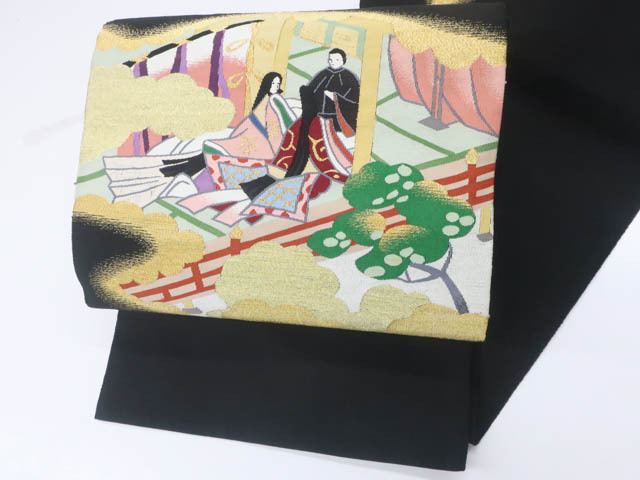 > 《古美術京松》【着物】八寸名古屋帯 太鼓柄 金糸 爪綴れ 開き仕立て 時代人物文 kyo7b06-119