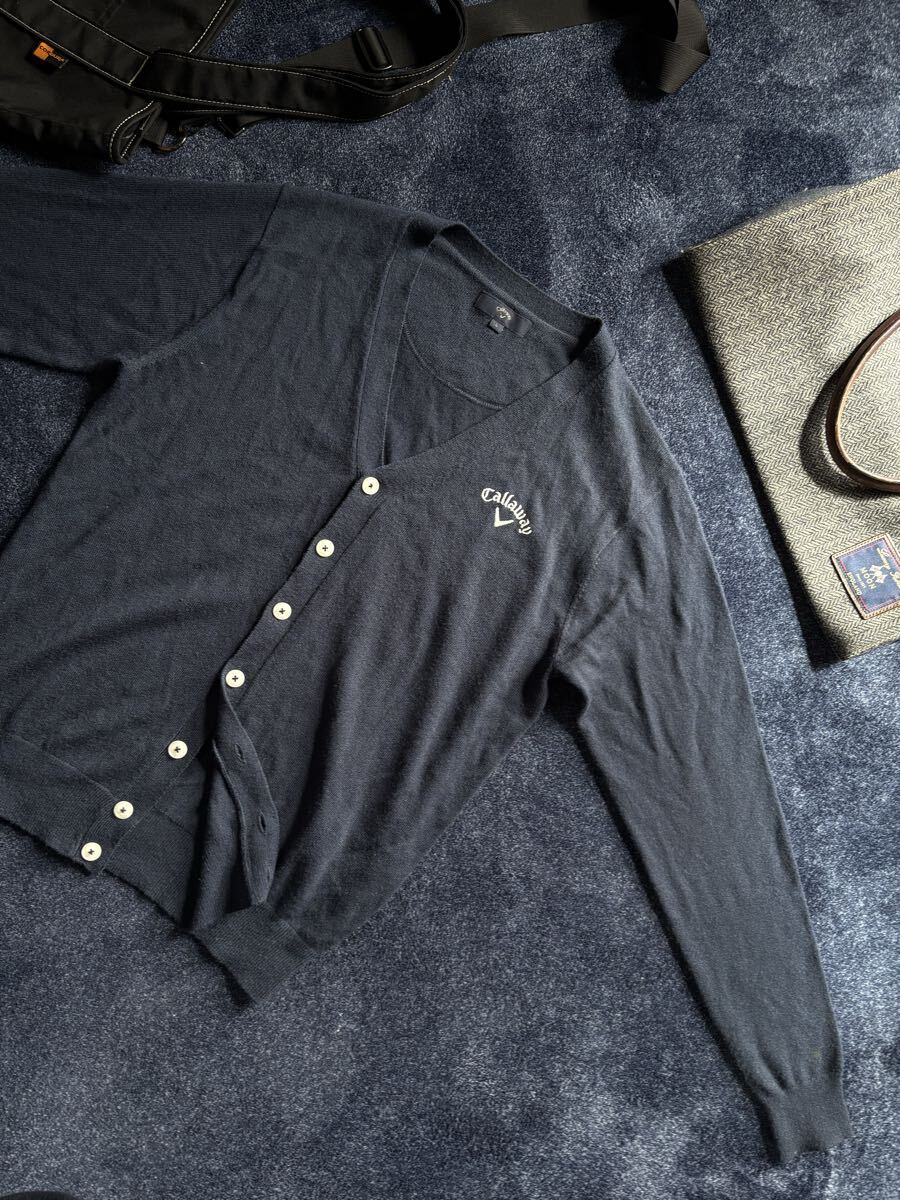 > 超美品 定価16,500円 Callaway キャロウェイ ゴルフウェア 高品質素材 豪華ロゴ Vネック ニット カーディガン sizeL ネイビー