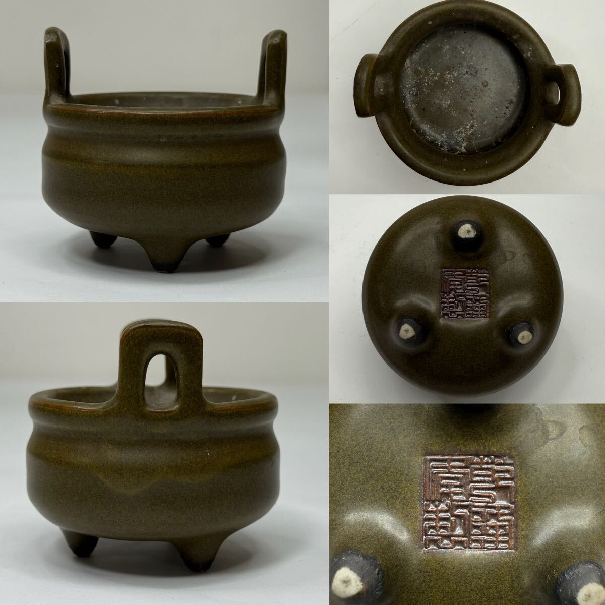 - LL-中国古美術 時代物 香炉 三足炉 茶葉末釉 蕎麦釉 小香炉 在銘 乾隆年製 唐物 陶磁器 中国古玩 骨董品