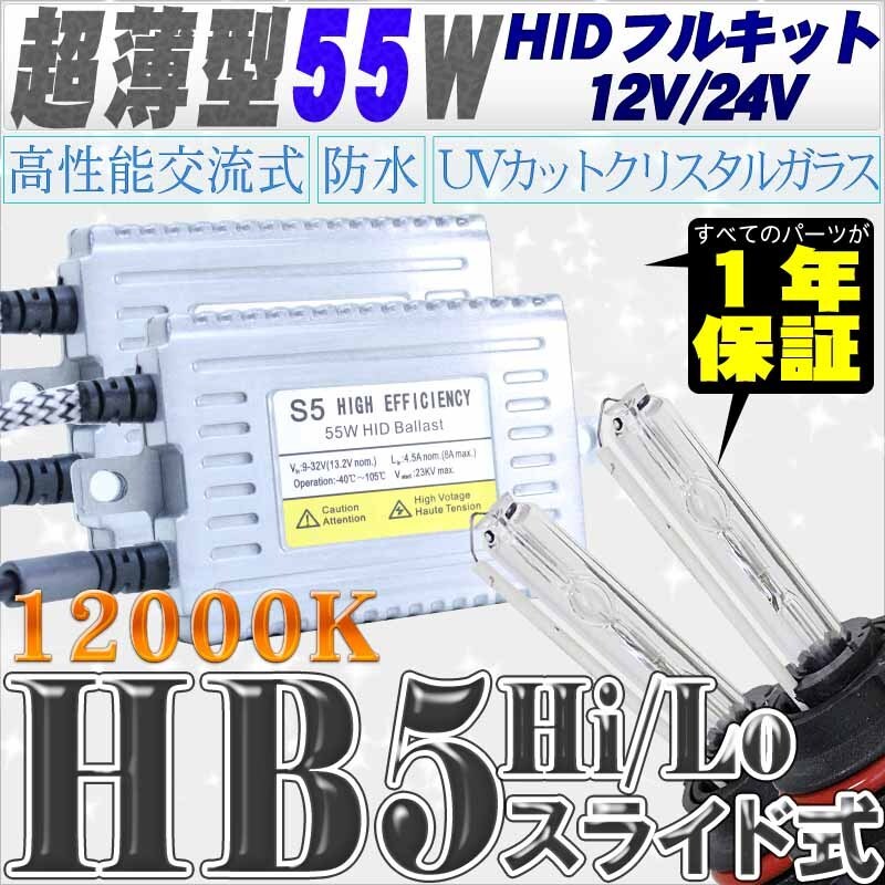 > 高性能 薄型HIDキット 55W HB5 Hi/Lo スライド式 リレー付 12000K 12V/24V 【交流式バラスト&クリスタルガラスバーナー】