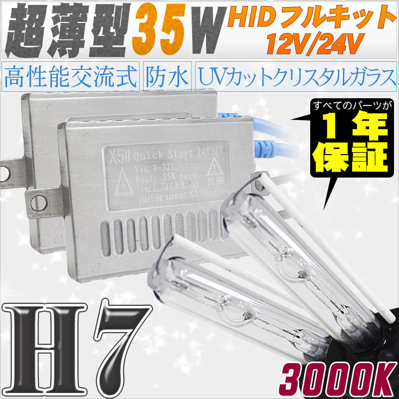- 高性能 薄型HIDキット 35W H7 3000K 12V/24V 【交流式バラスト&クリスタルガラスバーナー】