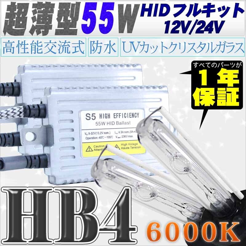 > 高性能 薄型HIDキット 55W HB4 リレー付 6000K 12V/24V 【交流式バラスト&クリスタルガラスバーナー】