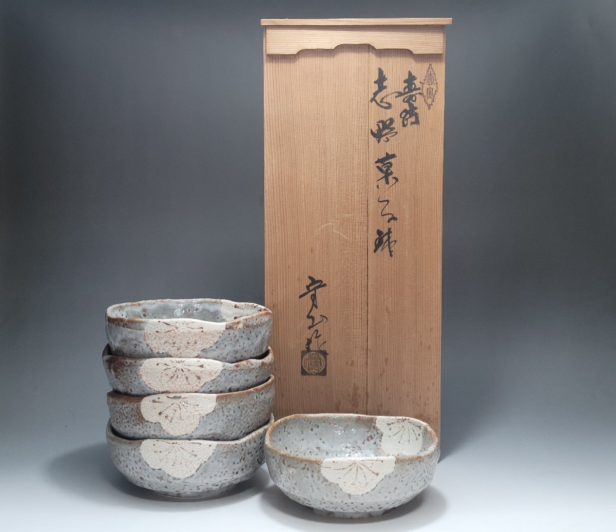 > 志野焼 雪山作 梅花文 5客 菓子鉢 共箱 幅約15.3cm / 茶碗 茶道具 煎茶道具 茶器 人間国宝 李朝 高麗 陶瓷器 唐物 古玩 古董