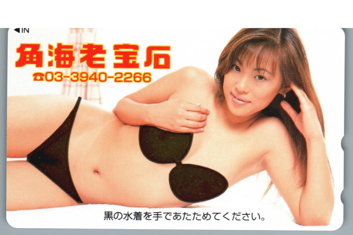 - ★【未使用】美女モデル 角海老宝石 黒の水着を手であたためてください。② テレホンカード テレカ B2-5-50-