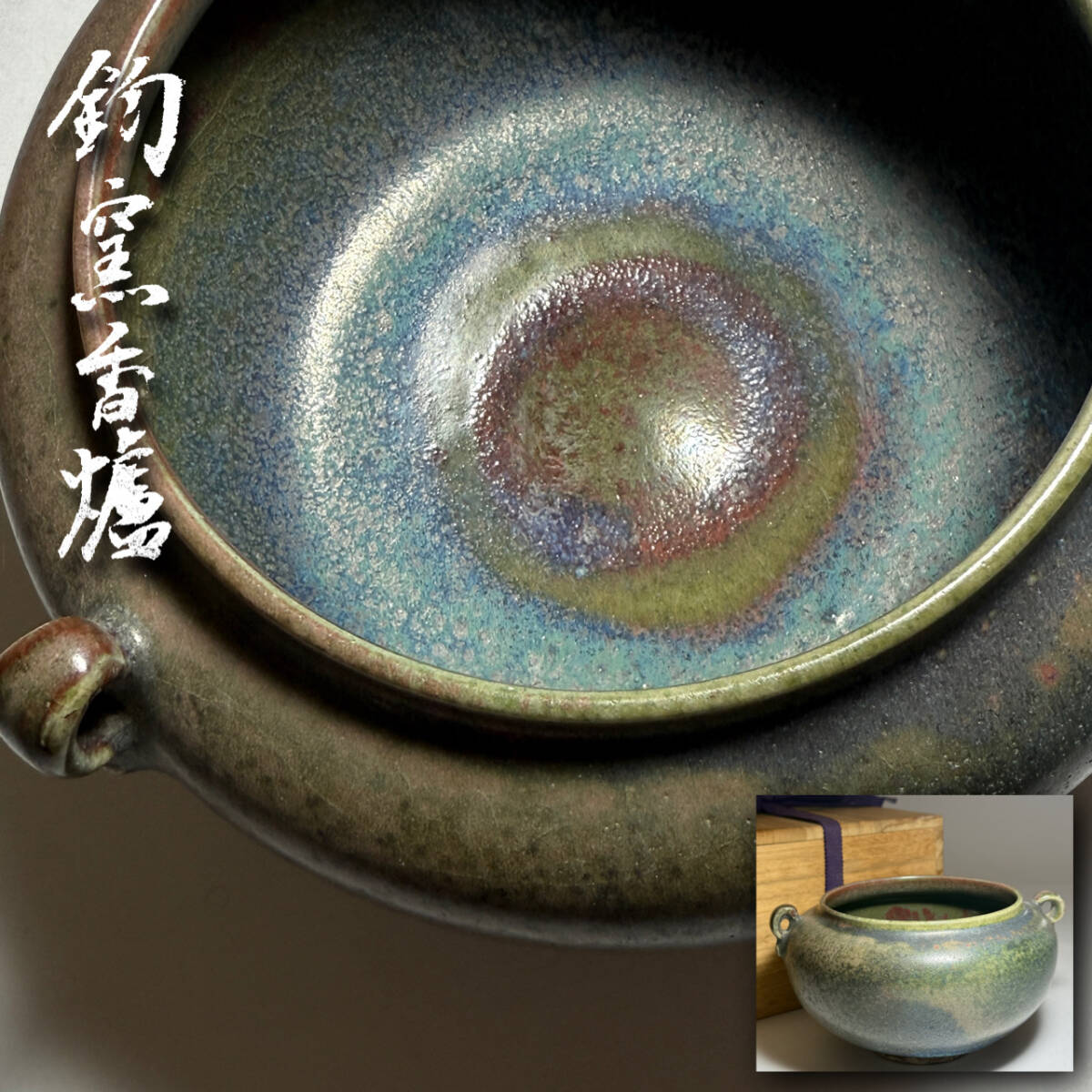 > 【茂蔵】中国古陶磁コレクター所蔵品 鈞窯香炉 双耳 伝世品 古渡り 四方桟桐箱付き 南宋〜元時代 唐物 中国古陶磁 中国美術