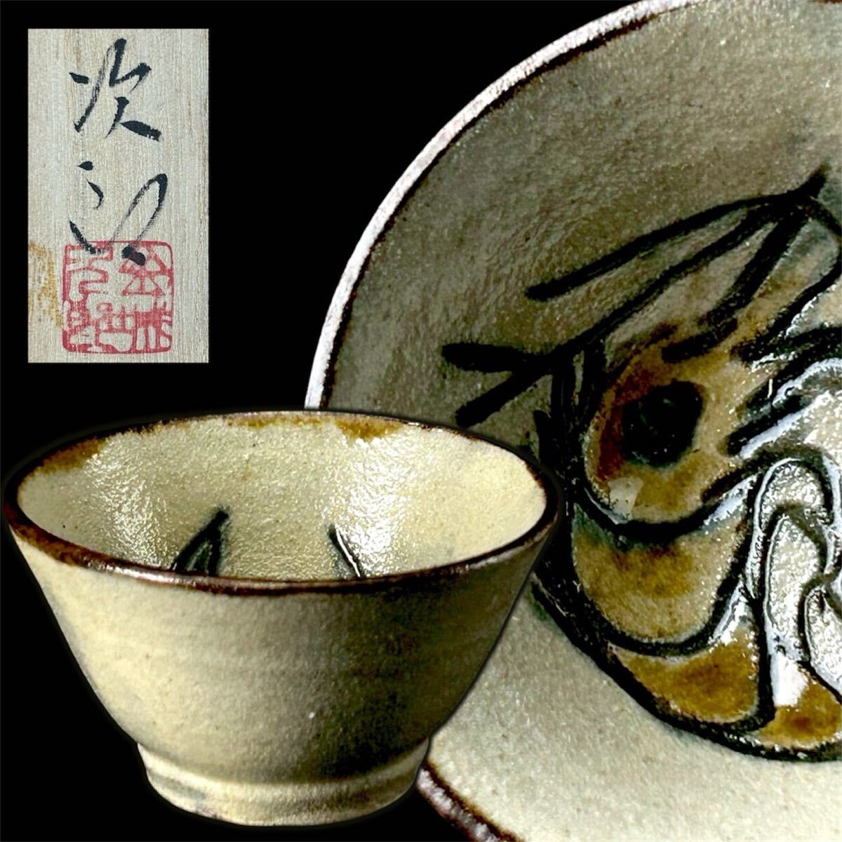 - 架夢 人間国宝 金城次郎 海老文 ぐい呑み 酒器 共箱 壺屋焼 盃 酒呑 唐物 骨董 古物 Aち3