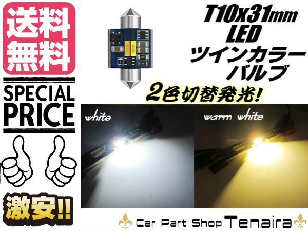 > 12V 2色切替 T10×31mm 白 電球色 ツインカラー LED バルブ ルームランプ 無極性 まくら球 ルーム球 ヒューズ型 室内灯 耐電圧 送料無料/3