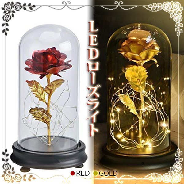 - 送料無料 LED ローズライト(レッド/ゴールド) マジカルローズ ランプ バラ ギフト クリスマス 贈り物 ガラスドーム 電池 赤 金 薔薇 光る