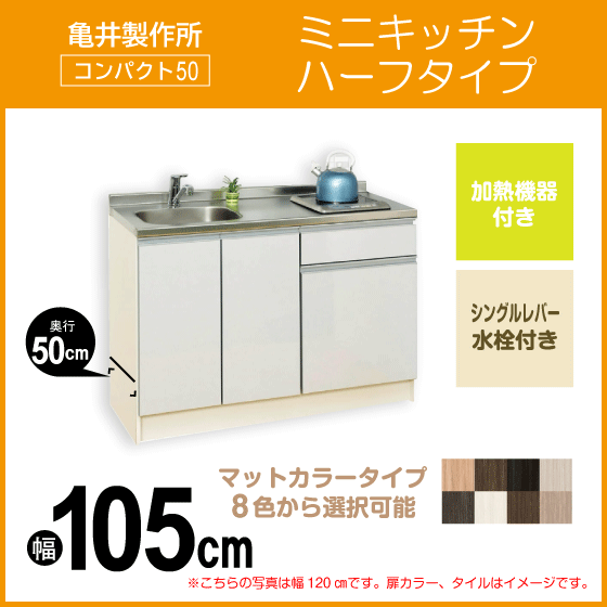 > ミニキッチン コンパクト50(扉カラー:マット) 間口105cm 下台のみ ハーフタイプ SS105FJTK2R,SS105FJTK2L 亀井製作所 1,050mm
